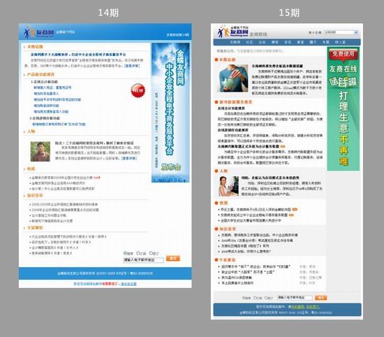 其實友商聯(lián)線15期和14期,在風格設(shè)計上是近似的,都是商務(wù)風格,簡潔大方,藍色調(diào)子,右邊為廣告區(qū)域。視覺設(shè)計并沒有新的改觀和體驗。