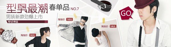 6例是男裝的banner設(shè)計(jì),大家在設(shè)計(jì)男裝時可以很好的妙用直線條,因?yàn)橹本€條是最好表現(xiàn)男性特征的一個設(shè)計(jì)元素。在生活中不難看見直線是眾多的男性品牌logo設(shè)計(jì)的根本元素。