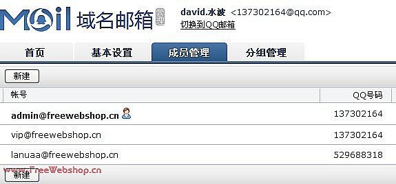 第10步: 看一下成員管理~~超爽~~~以后企業(yè)郵箱,別人發(fā)admin@freewebshop.com,用QQ就可以直接收到郵件了!!!!