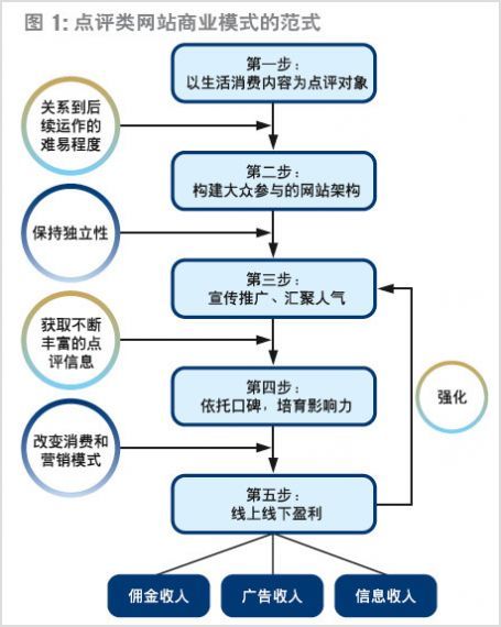 綜合對(duì)大眾點(diǎn)評(píng)網(wǎng)的剖析,可以發(fā)現(xiàn)點(diǎn)評(píng)類網(wǎng)站商業(yè)模式的范式,其經(jīng)營(yíng)軌跡可以分為五個(gè)基本步驟(如圖):第一步,確立以生活消費(fèi)內(nèi)容為點(diǎn)評(píng)對(duì)象,這直接關(guān)系到后續(xù)運(yùn)作的難易程度;第二步,構(gòu)建大眾參與的網(wǎng)站架構(gòu),樹立獨(dú)立形象,為網(wǎng)站的低成本運(yùn)作奠定基礎(chǔ);第三步,宣傳推廣,匯聚人氣,吸引用戶的點(diǎn)評(píng),獲取不斷豐富的點(diǎn)評(píng)信息;第四步,網(wǎng)聚用戶點(diǎn)評(píng),依托口碑的力量,通過改變消費(fèi)和營(yíng)銷模式,培育影響消費(fèi)者和被點(diǎn)評(píng)對(duì)象所屬商戶的能力;第五步,線上線下盈利,并通過盈利,進(jìn)一步加強(qiáng)網(wǎng)站的宣傳推廣,使其運(yùn)作達(dá)到良性循環(huán)。