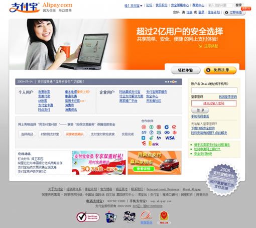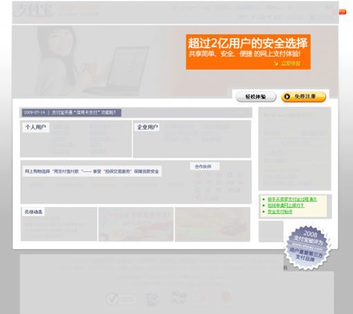 支付寶:大banner分為2塊,左邊是代表著用戶的大美女,右邊是體現(xiàn)實力的宣言“超過2億用戶的安全選擇”,輔助小字為:共享簡單、安全、快捷的網(wǎng)上支付體驗,具有親合力的美女,醒目的大標語,傳達給用戶的信息,支付寶的內(nèi)容構思很明顯比財付通更直接有效。