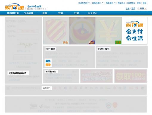財富通:支付服務(含個人和企業(yè)),生活好幫手,還沒有財富通帳戶,支付好幫手,合作銀行,共5塊主要內(nèi)容,兩個廣告區(qū)。