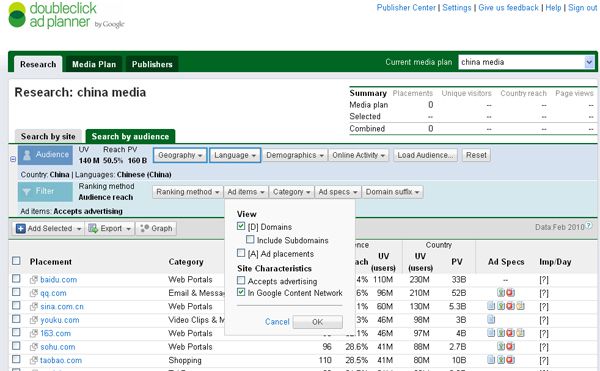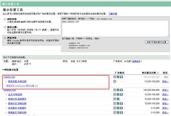 a、通過Google Ad Planaer 及Google Adwords展示位置工具(根據(jù)行業(yè)、描述、網(wǎng)址條件篩選目標(biāo)站點),尋找高質(zhì)量的內(nèi)容網(wǎng)絡(luò)站點。Google Ad Planaer支持國家、地區(qū)、語言、行業(yè)、所支持的廣告規(guī)格等綜合條件來篩選目標(biāo)站點。