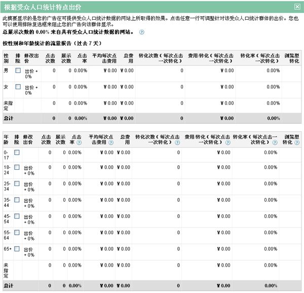 谷歌內(nèi)容網(wǎng)絡(luò)最具特色的一個功能,針對群體性別和年齡來定位,我們可以排除一些不可能使用我們產(chǎn)品的群體,還可以針對不同的群體設(shè)定不同的出價比例。 例如:我們在推廣一款網(wǎng)站分析監(jiān)測的產(chǎn)品,這部分群體大部分都是WA分析師在使用,群體大致在25~34歲之間,那么我們可以將此年齡群體的出價提升10%,這個群體類型的用戶將會有更多幾率看到我們的內(nèi)容網(wǎng)絡(luò)廣告。 這個功能準(zhǔn)確性有待驗證!