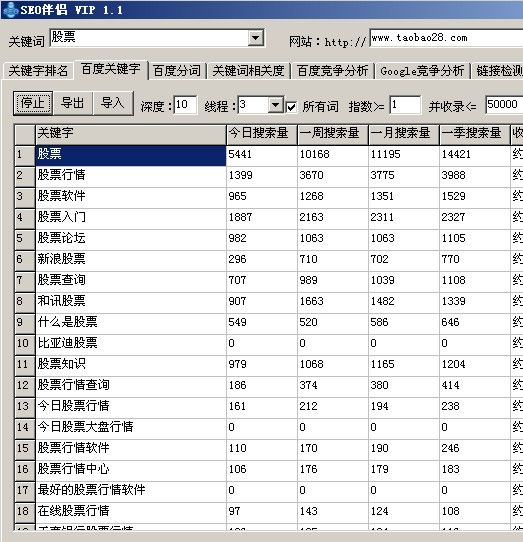 以前百度會(huì)提供相關(guān)搜索更多頁(yè)面,但是后來(lái)被百度關(guān)閉了,只有競(jìng)價(jià)用戶(hù)才能看到,這部門(mén)關(guān)鍵字?jǐn)?shù)據(jù)是非常有用的,之后便產(chǎn)生了很多的關(guān)鍵字選取軟件,軟件的數(shù)據(jù)來(lái)源是百度指數(shù),也就是原先的相關(guān)搜索,比如最常見(jiàn)的有SEO伴侶,SEO助手(這兩款都是付費(fèi)軟件)免費(fèi)的也可以用,但是出來(lái)的關(guān)鍵字很少,而且可能還被禁止導(dǎo)出,SEO伴侶我一直在用,價(jià)格一年也就幾十元,我記得好像是35元!SEO助手價(jià)格相對(duì)比較貴,但是里面除了這個(gè)功能外,其他功能還有很多,還有最新的一個(gè)網(wǎng)站叫追詞網(wǎng)(http://www.zhuici.com/ )這個(gè)網(wǎng)站不需要給錢(qián),但是需要用一個(gè)PR=3的鏈接換取VIP會(huì)員級(jí)別,有資源的可以去用一下!下面我以SEO伴侶為示范,找出“股票”相關(guān)的關(guān)鍵字~~