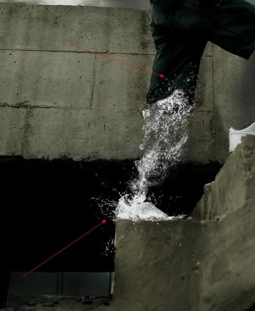 我們將下載的素材進(jìn)行適當(dāng)?shù)淖冃纹春?,形成左腿的形狀,注意邊緣的飛濺效果,這樣才有動(dòng)感和真實(shí)感,如圖