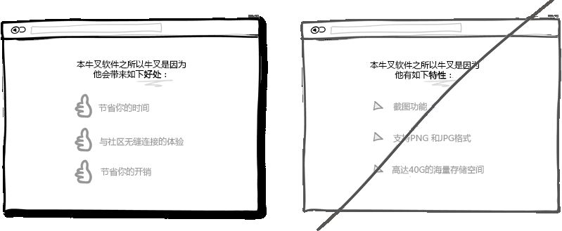 市場就是這樣的,用戶永遠(yuǎn)只關(guān)心自身利益而產(chǎn)品特性對(duì)他們來說倒不是那么重要。只有利益才更直觀地體現(xiàn)出使用產(chǎn)品所帶來的價(jià)值。Chris Guillebeau在他的著作《100美元起家》中指出,相比壓力,沖突,煩心事和未知的未來,人們?cè)诤醯酶嗟氖菒?,金錢,認(rèn)同感和自由支配的空閑時(shí)間。所以我相信在展示產(chǎn)品特性時(shí)回歸到利益上是必要的。