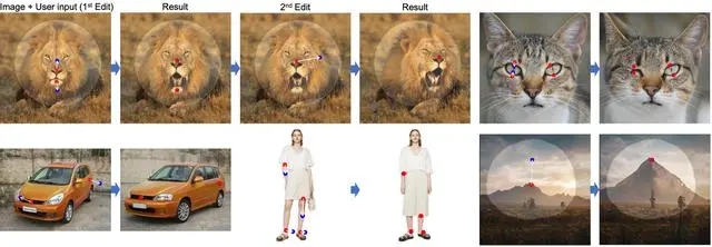1. 基于點(diǎn)的編輯:DragGAN允許用戶通過在屏幕上拖動(dòng)和放置點(diǎn)來直接更改圖像。這可以實(shí)現(xiàn)比傳統(tǒng)圖片編輯軟件更準(zhǔn)確和逼真的調(diào)整。